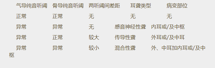 純音聽力檢查結果體現為純音聽力圖。</p><p> 正常情況下我們是通過兩條途徑來感受聲音信號的——氣導途徑和骨導途徑。前者我們非常熟悉,從外耳到中耳到內耳到聽中樞;后者我們或許不太注意:從顱骨直接到內耳到聽中樞。相應地,純音聽力檢查也有兩種聲音剌激方式,氣導輸入和骨導輸入。前者我們天天使用,而后者則很少被我們使用。事實上,兩閾值曲線的異同正是我們判斷聽損病變部位的基礎(見下表)。了解患者病變部位對于獲得他們的信任以及確定助聽器電聲性能都有非同尋常的意義。因此,有條件的時候還是應當重視骨導聽閾測試。</p><p style="text-align: center;"><img src="/upfiles/201906100237368907.png" alt="" /><br /></p><p> 更多詳情請登錄聽覺有道助聽器m.xmyuanxu.cn</p>" />