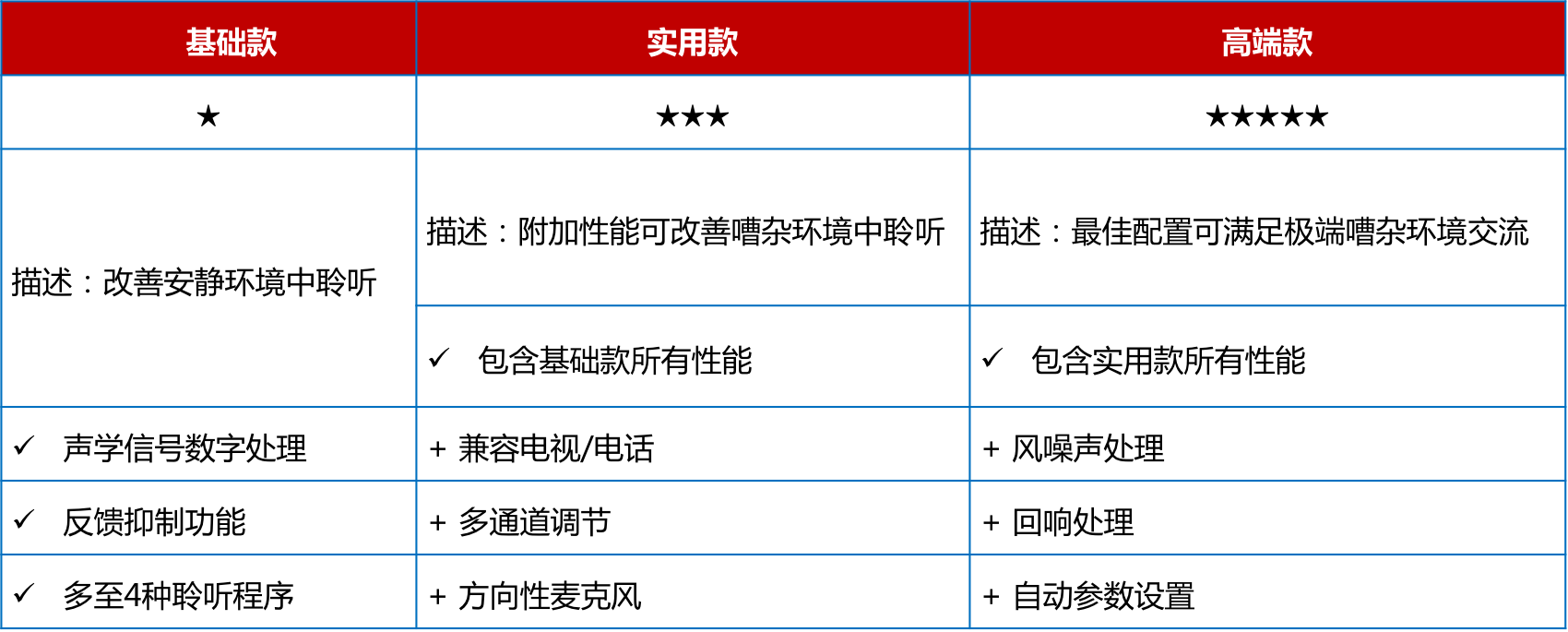 <span style="font-size:16px;"> 助聽器價格取決于機器的檔次,而檔次由內(nèi)含的技術種類決定。助聽器檔次大致可分為基礎款、實用款、高端款。這三種檔次的區(qū)別請參見下表:</span></p><p style="text-align: center;"><span style="font-size:16px;"><img src="/upfiles/201808150226553383.png" width="640" alt="" /><br /></span></p><p><span style="font-size:16px;"> 那么,如何應該選擇哪種檔次的助聽器呢?</span></p><p><span style="font-size:16px;"> 選擇助聽器時主要需要考慮兩大因素。首先要考慮的就是弱聽人士的聽力損失程度,其次要考慮的就是弱聽人士的日常生活方式。比方說,某位弱聽人士是中度聽力損失,日常在家為主,那么實用款檔次助聽器通??梢詽M足TA的需求。</span></p><p><span style="font-size:16px;"> 當然,這里只是為助聽器選配提供了大致方向,如何選配仍然需要具體情況具體分析,最好還是需要跟驗配師面對面溝通。</span></p><p><span style="font-size:16px;"> 1、高端款助聽器</span></p><p><span style="font-size:16px;"> 不同廠家的高端款助聽器均代表了各自的尖端技術,并致力于提供最佳的音質(zhì)。</span></p><p><span style="font-size:16px;"> 這類助聽器高端之處在于自動適應各種聆聽環(huán)境,最優(yōu)化佩戴者的聆聽清晰度和舒適度,讓佩戴者在極度嘈雜的環(huán)境中,如咖啡館,也能清晰地聽到同伴的言語聲。常見性能包括:</span></p><p><span style="font-size:16px;"> (1) 多種外觀、顏色可選;</span></p><p><span style="font-size:16px;"> (2) 環(huán)境自適應;</span></p><p><span style="font-size:16px;"> (3) 360°信號追蹤;</span></p><p><span style="font-size:16px;"> (4) 兼容各種藍牙設備。</span></p><p><span style="font-size:16px;"> 高端款助聽器為什么能夠自動適應各種聆聽環(huán)境呢?這是因為左右兩側的高端款助聽器能夠相互“通電報”,精準判斷所處的聆聽環(huán)境并自主學習,給出最佳的助聽設置。</span></p><p><span style="font-size:16px;"> 比如,您經(jīng)常出入一家書店,每次您進入這家書店時總是習慣性地將音量調(diào)低2分貝;長此以往,當您再次進入該書店時,兩臺助聽器將會默契地降低2分貝。</span></p><p><span style="font-size:16px;"> 360°信號追蹤可以幫助佩戴者建立更佳的空間感知,對所處環(huán)境有充足的把控和預判,避免一些潛在的危險。而當助聽器連接至各種藍牙設備時,聆聽清晰度會更高,且不會打擾其他人。</span></p><p><span style="font-size:16px;"> 比如家人總是抱怨您把電視機聲音開得太大,拒絕跟您一起觀看電視時,您可以選配能夠兼容電視的助聽器,并進行獨立的音量調(diào)節(jié),而家人只需設置為常規(guī)音量即可。高端款助聽器的價位一般在15000以上。</span></p><p style="text-align: center;"><span style="font-size:16px;"><img src="/upfiles/201808150228328500.jpg" alt="" /><br /></span></p><p><span style="font-size:16px;"> 2、實用款助聽器</span></p><p><span style="font-size:16px;"> 實用款助聽器的價格一般在8000~15000之間。實用款助聽器包含一定的降噪技術和言語提升功能,可以滿足大多數(shù)環(huán)境中的聆聽需求。部分廠家的實用款助聽器也可兼容各種藍牙設備。實用款助聽器的突出性能大致包括:</span></p><p><span style="font-size:16px;"> (1) 可連接外接音源;</span></p><p><span style="font-size:16px;"> (2) 言語清晰度提升;</span></p><p><span style="font-size:16px;"> (3) 方向性功能。</span></p><p><span style="font-size:16px;"> 3、基礎款助聽器</span></p><p><span style="font-size:16px;"> 基礎款助聽器的價位一般在8000以下?;A款助聽器能夠滿足安靜環(huán)境中的交流需求,并具備反饋管理功能。反饋管理功能能夠有效提升佩戴舒適度,避免在日常佩戴過程中出現(xiàn)尖銳的干擾聲。</span></p><p><span style="font-size:16px;"> 基礎款助聽器適用于經(jīng)常在家的弱聽人士,若是生活方式比較豐富多彩的弱聽人士建議選配其他檔次的助聽器。實用款助聽器的突出性能大致包括:</span></p><p><span style="font-size:16px;"> (1) 數(shù)字信號處理技術;</span></p><p><span style="font-size:16px;"> (2) 反饋管理功能;</span></p><p><span style="font-size:16px;"> (3) 多種聆聽程序可選。</span></p><p><span style="font-size:16px;"> 更多詳情請登錄m.xmyuanxu.cn。</span></p>" />